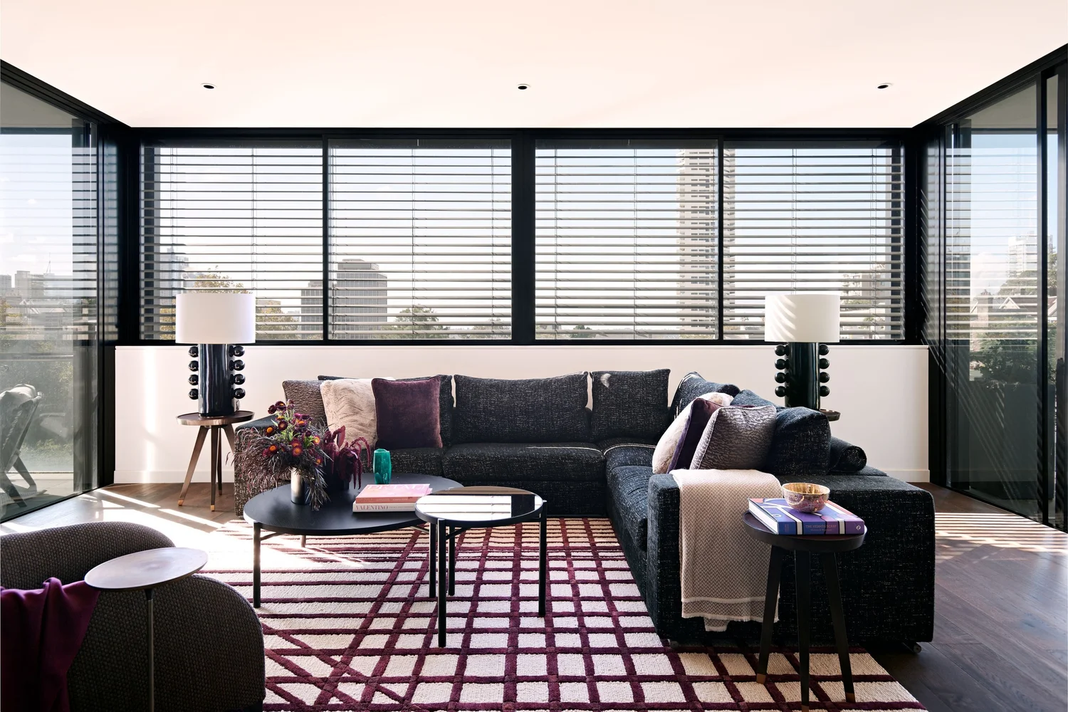 This living room is almost monochrome—except for the swaths of burgundy in the rug, gliding across the floor and intersecting at the rug's edges. White walls and dark gray furniture keep the rest of the space simple. This living room's contrasting tones make it a lively, cheery space despite there not being an abundance of color.